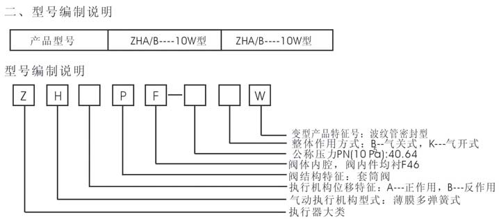ZHA/BPF-10/16W型輕小型氣動(dòng)薄膜單座襯塑調(diào)節(jié)閥(以下簡稱襯塑閥)由直通單座襯塑閥和氣動(dòng)薄膜多彈簧執(zhí)行機(jī)構(gòu)二部分組成,由于襯塑閥閥內(nèi)腔和閥內(nèi)件襯有聚全氟乙丙烯(簡稱F46),并在上閥蓋內(nèi)采用聚四氟乙烯波紋管密封結(jié)構(gòu),因而襯塑閥可廣泛用于對(duì)鹽酸、硫酸、氫氟酸、王水、各種強(qiáng)堿和強(qiáng)氧化劑等具有較強(qiáng)腐蝕性的介質(zhì)的調(diào)節(jié)控制。